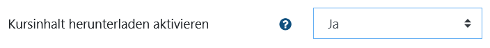 Stellen Sie im Abschnitt Allgemeines die Option Kursinhalt herunterladen aktivieren auf Ja. Den Schüler/innen wird anstelle des Bearbeiten einschalten Buttons die Option Kursinhalt herunterladen angezeigt.