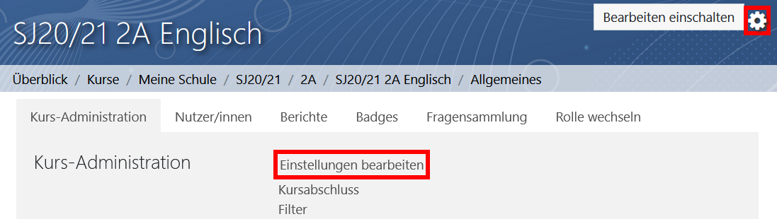 Lehrer/innen können den Schüler/innen ermöglichen alle Kursinhalte gesammelt herunterzuladen. Um Kursinhalte zum Herunterladnen freizugeben, klicken Sie im Zahnrad rechts oben auf Einstellungen bearbeiten.